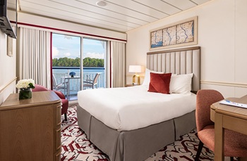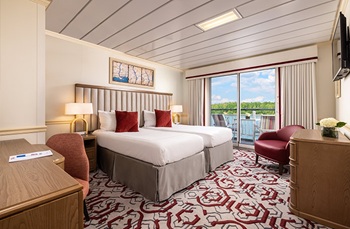 Located on the 4th Deck, the Deluxe Balcony stateroom offers 285 square feet, offering an unmatched amount of space for river cruising. The open layout features full-size furniture and plenty of space to comfortably move around the room. The spacious bathroom offers a large shower and a full array of premium amenities. Floor-to-ceiling sliding glass doors fill the room with natural light and open onto a private balcony with deck furniture, extending the living area outdoors.