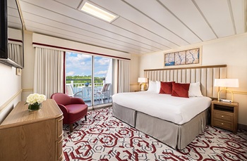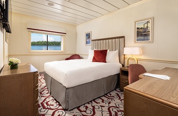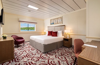 The Standard Waterview stateroom, located on the Main Deck, offers an impressive 245 square feet. The open layout provides ample room to move around freely or relax in your lounge chair. Storage solutions include a closet, deep dresser drawers, and a desk with drawers. The spacious bathroom offers a large shower, complete with a full array of premium amenities. Picture windows flood the room with natural light and frame stunning water views.